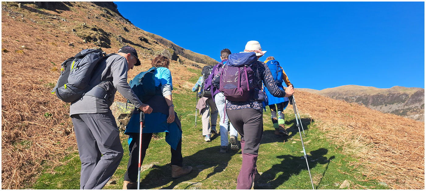 The seasoned six start their ascent of Birkhouse Moor, leaving hordes behind